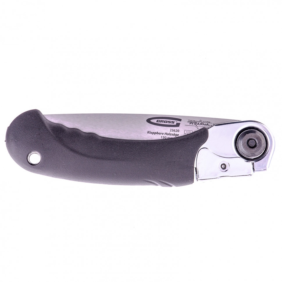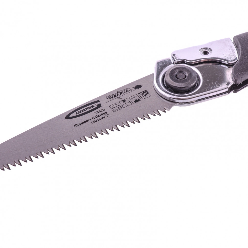 Складная пила по дереву Gross PIRANHA 23620 с полотном длиной 130 мм, калеными зубьями с 3D-заточкой и шагом 8-9 TPI, с обрезиненной рукояткой, в кобуре, предназначена для кемпинга и работы в саду. Подходит для продольного и поперечного пиления древесины. Зубья с трехгранной заточкой и шагом 8-9 TPI обеспечивают быструю распиловку. Пила легко складывается, поэтому ее можно брать с собой в поездку, поход или на пикник, не опасаясь пораниться в процессе транспортировки. В комплект входит чехол-кобура, которую можно повесить на ремень. Полотно изготовлено из высококачественной японской стали SK-5 твердостью 52 HRC, поэтому характеризуется прочностью и износостойкостью.