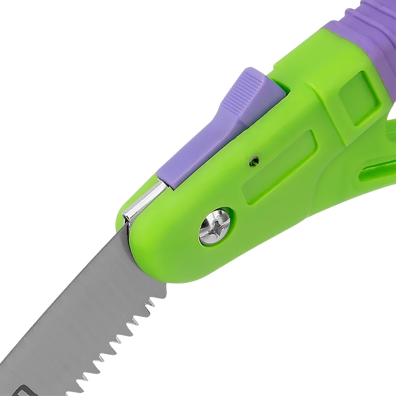 Складная садовая пила Palisad 60411 оснащена лезвием длиной 175 мм, удобной пластиковой ручкой с резиновым покрытием и защитной накладкой. Она используется для резки как сухого, так и влажного дерева вдоль волокон и поперек. Трехгранные зубцы с частотой 6-7 на дюйм упрощают процесс и гарантируют аккуратный разрез. Благодаря компактному складывающемуся механизму инструмент удобен для переноски и хранения, особенно полезен при выполнении работ вне дома или в туристических поездках.