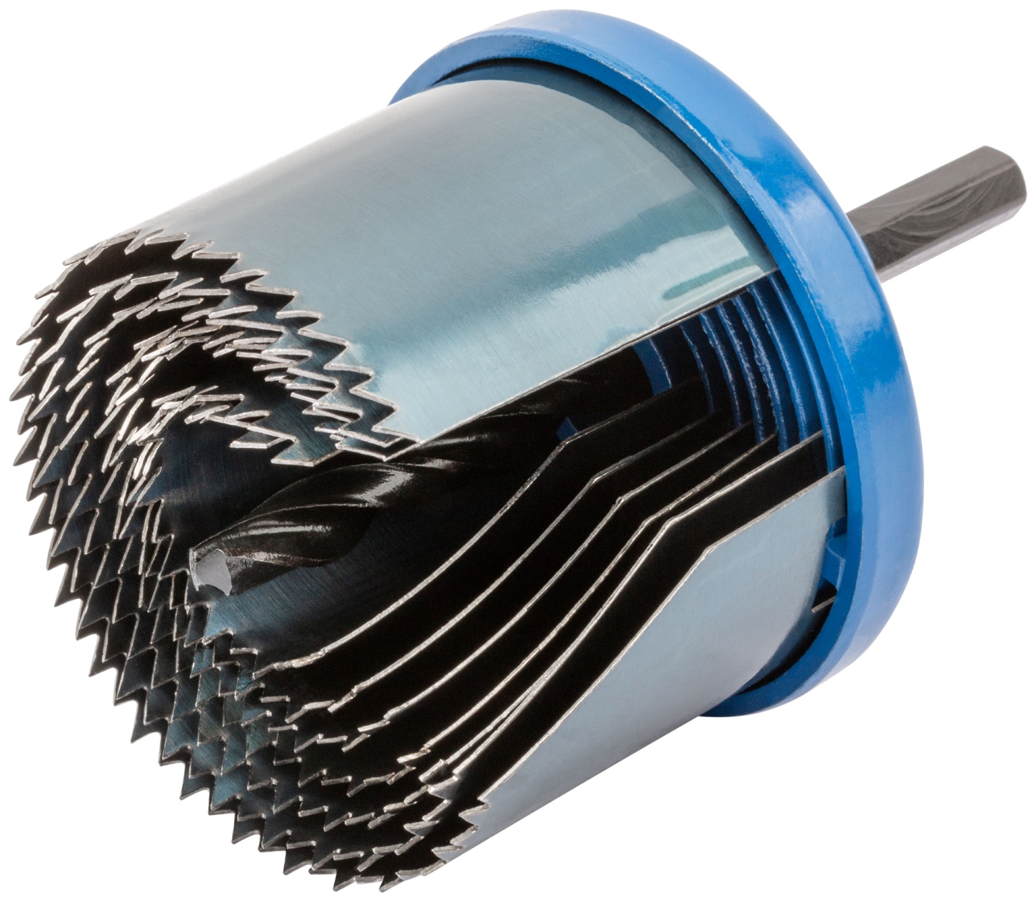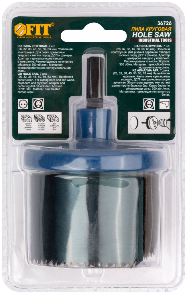 Профи. 7 лезвий. Калёный зуб. Усиленный адаптер. Для твёрдых пород древесины, фанеры, ДСП. D=26-32-38-45-50-56-63 мм. Материал: термообработанная усиленная инструментальная сталь. Упаковка: блистер.