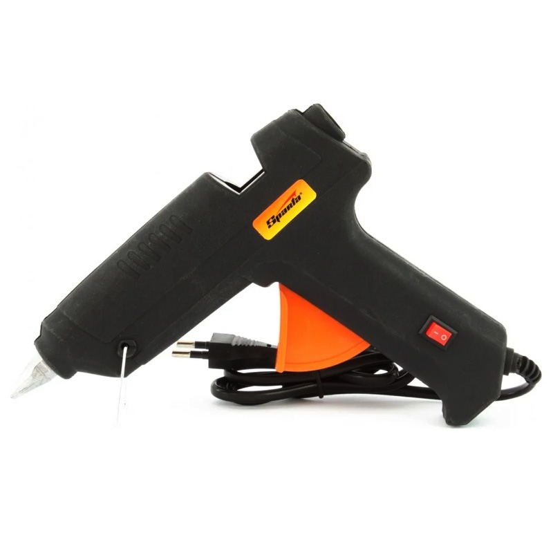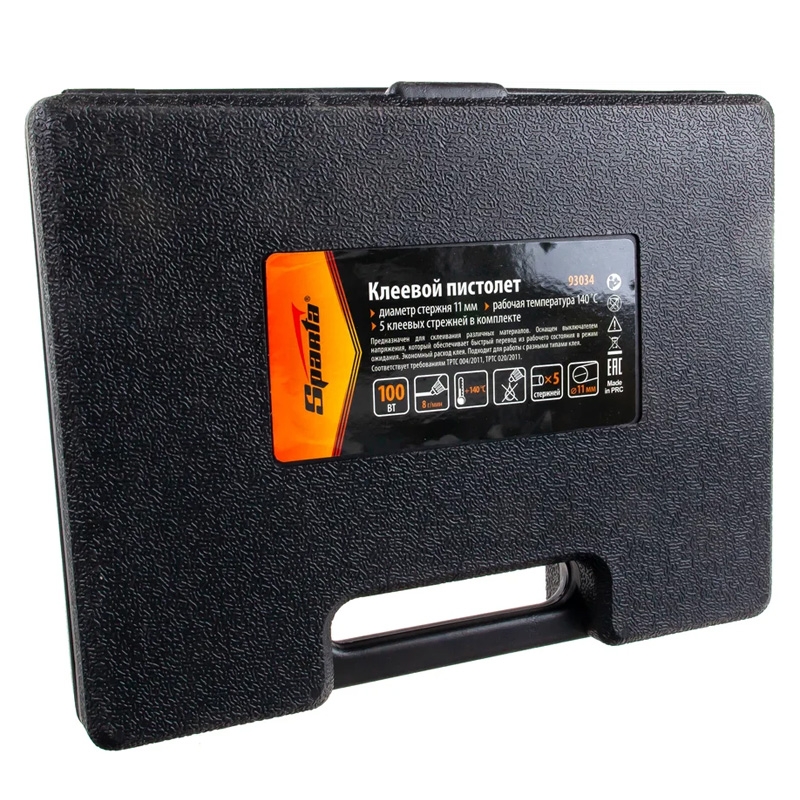 Клеевой пистолет Sparta 93034, 12 мм, 100 Вт, 8 г/мин, в кейсе, пригодится при проведении несложных бытовых работ: склеивания бумаги, дерева, пластика и других материалов. Он станет незаменимым помощником для частных мастеров, которые занимаются мелким ремонтом, упаковкой, сборкой различных моделей и рукоделием. Время нагрева до максимальной температуры не превышает 5 минут.ПреимуществаКорпус из ударопрочной пластмассы устойчив к механическим повреждениям.Встроенный выключатель позволяет оперативно отключать пистолет, не трогая сетевую вилку.Во время работы пистолет можно устанавливать на металлическую скобу-подставку, это повышает удобство эксплуатации.Специальное окошко позволяет отслеживать уровень расхода стержня внутри ствола.Противокапельная система обеспечивает оптимальный расход клея.Пластиковый кейс позволяет с удобством хранить и транспортировать пистолет. Время нагрева 5-7 минут.