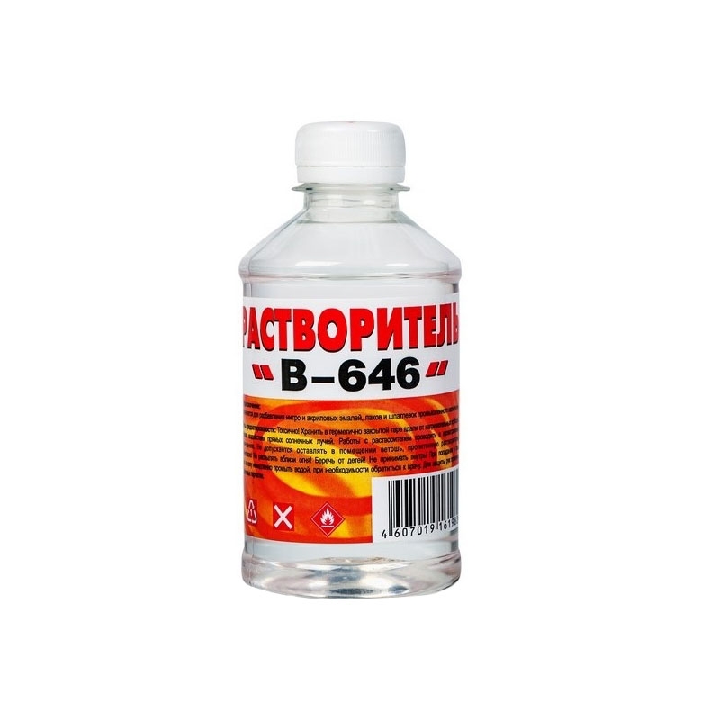 Растворитель В-646 250 мл Вершина применяется только на тех поверхности, которым не особо требуется бережное отношение.В основном, нужен для того, чтобы из старого затвердевшего лака сделать жидкий, пригодный для работы. Не следует путать с разбавителем – у него другие функции. При необходимости работы со шпатлёвкой – тоже используется растворитель. Растворитель 646 может участвовать как для очищения инструментария для покраски, так и для избавления от органических пятен.