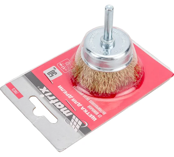 Щетка для дрели «чашка» Matrix 74475 диаметром 50 мм, со шпилькой, с щетиной из латунированной витой проволоки, используется для очистки металлических, деревянных и пластиковых поверхностей от незначительных загрязнений и остатков лакокрасочных покрытий. Помогает подчеркнуть структуру материала или придать ему шероховатость. Форма чашки позволяет обрабатывать плоские участки большой площади. Хвостовик диаметром 6 мм устанавливается в патрон электродрели, поддерживающей скорость 4500 об/мин. Во время работы нужно использовать средства индивидуальной защиты — респиратор, очки, наушники, спецодежду и обувь.