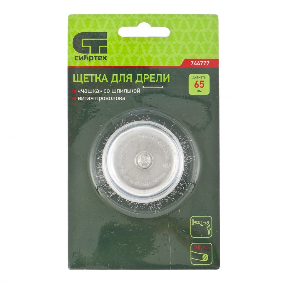 Щетка для дрели «чашка» Сибртех 744777 диаметром 65 мм, со шпилькой 6 мм, с щетиной из витой проволоки 0,3 мм, предназначена для щадящей обработки значительных по площади металлических, деревянных и пластиковых поверхностей — удаления загрязнений, остатков краски и лака, придания шероховатости или подчеркивания структуры материала. Щетка имеет форму чашки, что увеличивает площадь прилегания щетины к обрабатываемой поверхности. Насадка с хвостовиком 6 мм устанавливается в патрон электродрели, поддерживающей работу со скоростью 4500 об/мин. Во время работы с инструментом обязательно использование защитной одежды и обуви, очков, респиратора и наушников. Щетку применяют в профессиональной сфере и в быту. Преимущества Щетина изготовлена из высококачественной стальной проволоки, обеспечивающей долговечность оснастки. Витая проволока принимает изначальную форму после снятия нагрузок, поэтому щетина не деформируется при интенсивном использовании. На корпус нанесено цинковое покрытие, а на щетину — техническое масло