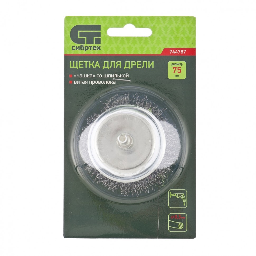 Щетка для дрели «чашка» Сибртех 744787 диаметром 75 мм, со шпилькой 6 мм, с щетиной из витой проволоки 0,3 мм, предназначена для щадящей обработки значительных по площади металлических, деревянных и пластиковых поверхностей — удаления загрязнений, остатков краски и лака, придания шероховатости или подчеркивания структуры материала. Щетка имеет форму чашки, что увеличивает площадь прилегания щетины к обрабатываемой поверхности. Насадка с хвостовиком 6 мм устанавливается в патрон электродрели, поддерживающей работу со скоростью 4500 об/мин. Во время работы с инструментом обязательно использование защитной одежды и обуви, очков, респиратора и наушников. Щетку применяют в профессиональной сфере и в быту. Преимущества Щетина изготовлена из высококачественной стальной проволоки, обеспечивающей долговечность оснастки. Витая проволока принимает изначальную форму после снятия нагрузок, поэтому щетина не деформируется при интенсивном использовании. На корпус нанесено цинковое покрытие, а на щетину — техническое масло