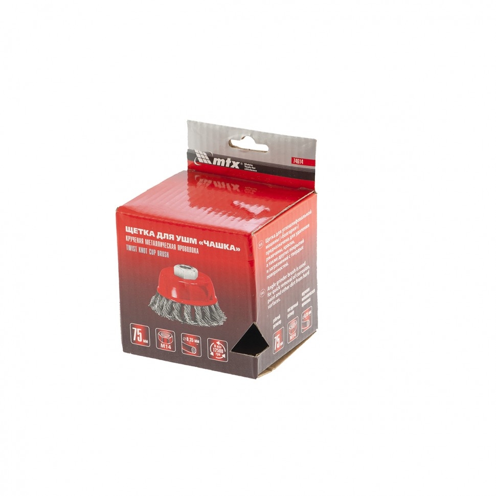 Щетка Matrix «Чашка» 74614 диаметром 75 мм, М14, с крученой проволокой 0,35 мм, применяется в качестве оснастки на УШМ. Щетина рассчитана на грубую (черновую) обработку поверхностей, но менее агрессивную в сравнении с щетиной 0,5 мм. Изделие подходит для удаления загрязнений, снятия толстого слоя ржавчины, ЛКМ, зачистки сварных швов. Рекомендуемая скорость использования — 12500 об/мин. Преимущества Благодаря высококачественной проволоке оснастка прослужит долгое время. Благодаря форме «чашка» насадка имеет большую площадь прилегания, поэтому оптимально подходит для обработки больших поверхностей. Щетку универсального назначения можно использовать для обработки любых твердых материалов: металла, древесины, цветных металлов, пластика и др. Корпус покрыт эмалью, а щетина — маслом, за счет чего щетка устойчива к коррозии.