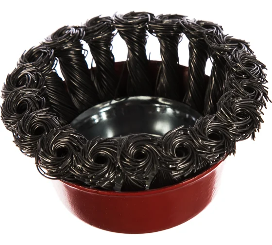 Щетка Matrix «Чашка» 74624 диаметром 75 мм, с присоединительной резьбой М14, с щетиной из крученой проволоки диаметром 0,5 мм, устанавливается на УШМ, поддерживающую работу со скоростью 12500 об/мин. Изделие предназначено для грубой (черновой) обработки поверхностей и подходит для удаления загрязнений, снятия толстого слоя ржавчины, ЛКМ, зачистки сварных швов.