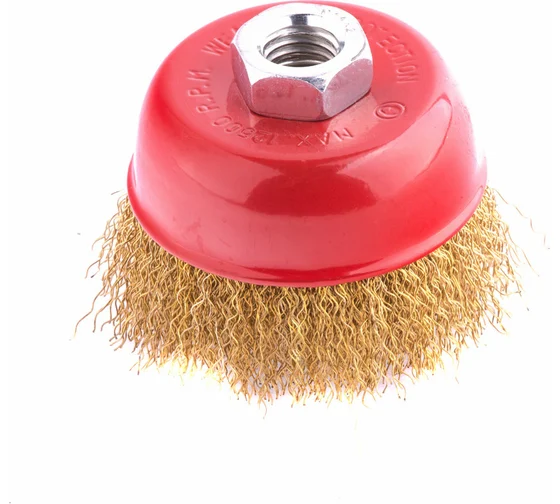 Щетка «чашка» Matrix 74604 диаметром 75 мм, с щетиной из латунированной витой проволоки, устанавливается на вал УШМ с помощью гайки М14. Предназначена для снятия тонкого слоя краски или лака, удаления ржавчины и загрязнений. При рекомендованной скорости вращения 12500 об/мин щеткой можно быстро обрабатывать участки большой площади.