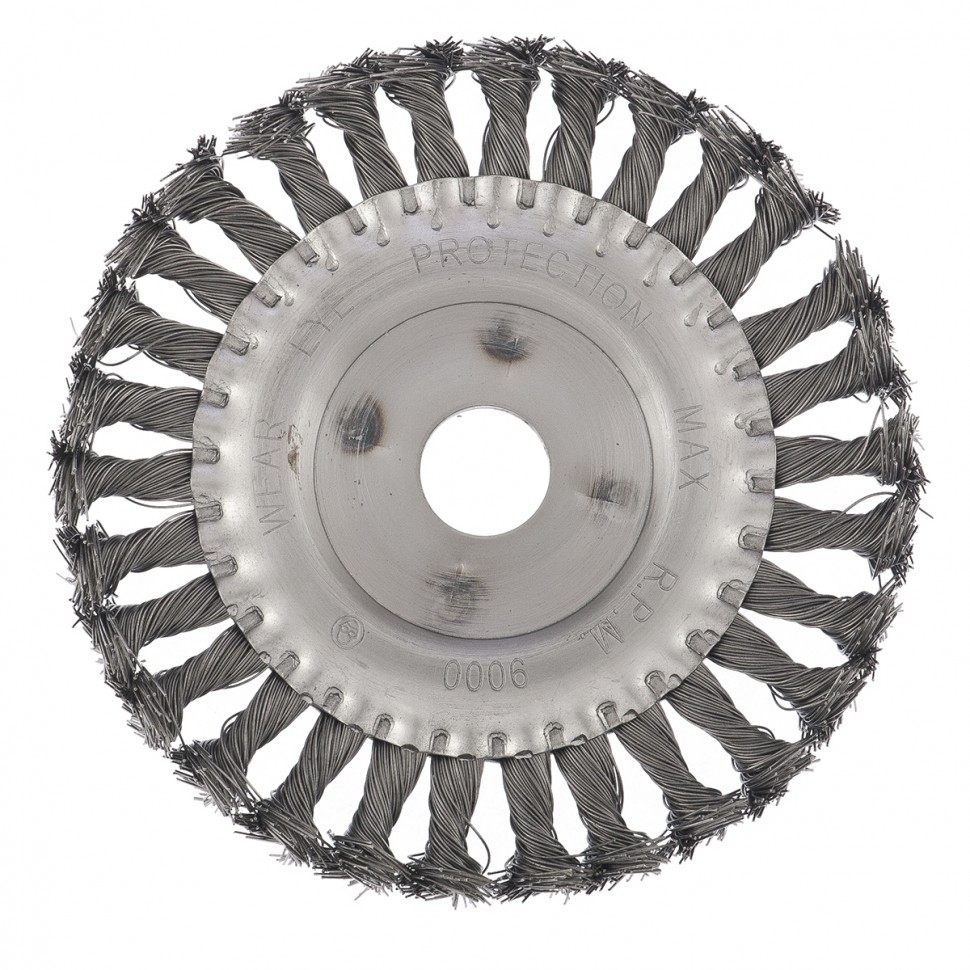 Плоская щетка Сибртех 746347 диаметром 150 мм и посадкой 22,2 мм, с крученой проволокой 0,5 мм, устанавливается на вал УШМ. Щетина с крученой проволокой эффективно удаляет толстый слой ржавчины, лакокрасочных материалов и загрязнения с поверхностей при проведении грубой (черновой) обработки. Плоская форма позволяет обрабатывать труднодоступные места, в т.ч. углы и изгибы. Рекомендуется использовать щетку на оборотах не более 9000 об/мин. Преимущества За счет высококачественной нержавеющей проволоки обеспечивается долговечность щетины. Универсальная щетка рассчитана на обработку твердых поверхностей из любых материалов: металла, древесины, цветных металлов, пластика и т.д. Щетку можно использовать вне помещений, т.к. щетина покрыта маслом, а корпус оцинкован.
