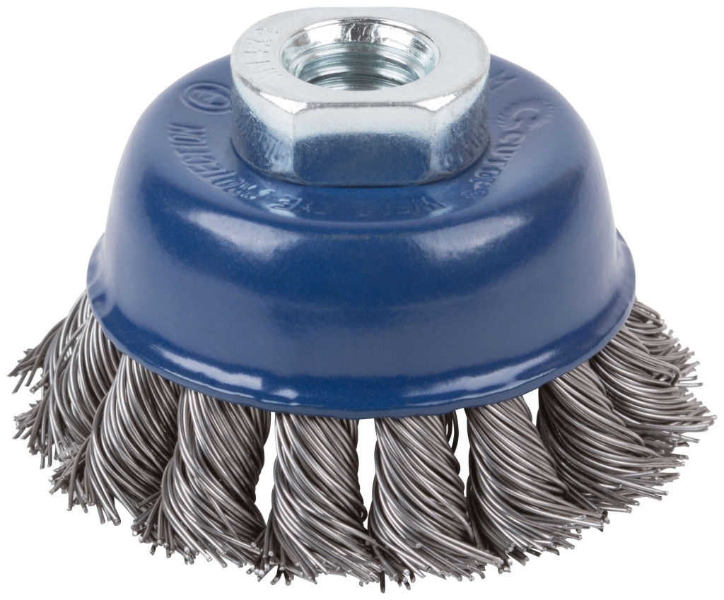 Щетка для УШМ, тип «Чашка», М14, отлично подходит для обработки больших плоскостей. Форма «Чашка» обеспечивает хорошую площадь прилегания к поверхности. Конструкция щетки оснащена усиленной гайкой с шайбой (кроме D65), которая способствует предотвращению деформации изделия. Идеальная балансировка щеток значительно продлевает срок службы инструмента. Металлическая проволока 0,5 мм.