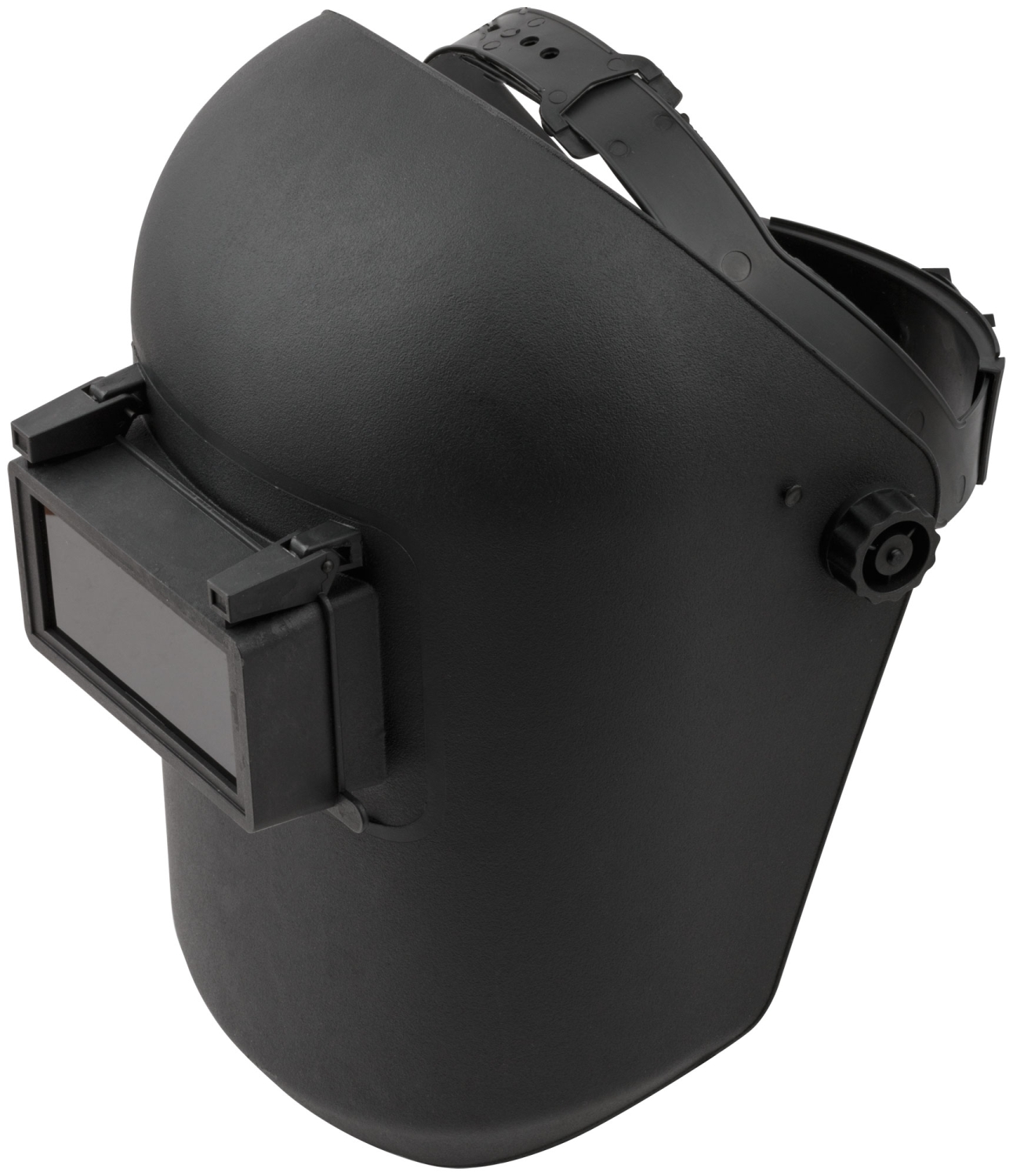 Щиток сварщика с откидывающимся стеклом. С креплением на голову. Сменное стекло 107 х 50:мм. Предназначена для защиты глаз при сварочных работах. Регулируемый, фиксируемый наголовник. Откидывающееся затемненное стекло. Степень затемнения DIN 10. Материал: пластик, термостойкое затемненное стекло.