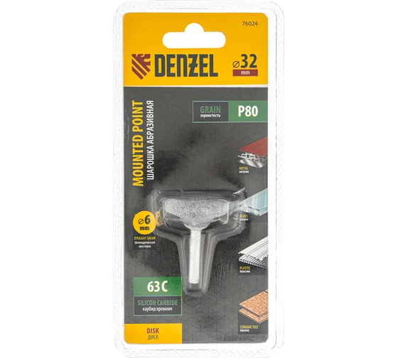 Шарошка абразивная Denzel 76024 с рабочей частью в форме диска 32 х 12 мм, с хвостовиком диаметром 6 мм, — оснастка для дрели, шуруповерта или прямошлифовальной машины (ПШМ). Используется для зачистки кромок, снятия заусенцев и фасок. Будет полезна при выполнении кузовных, ремонтных и отделочных работ.