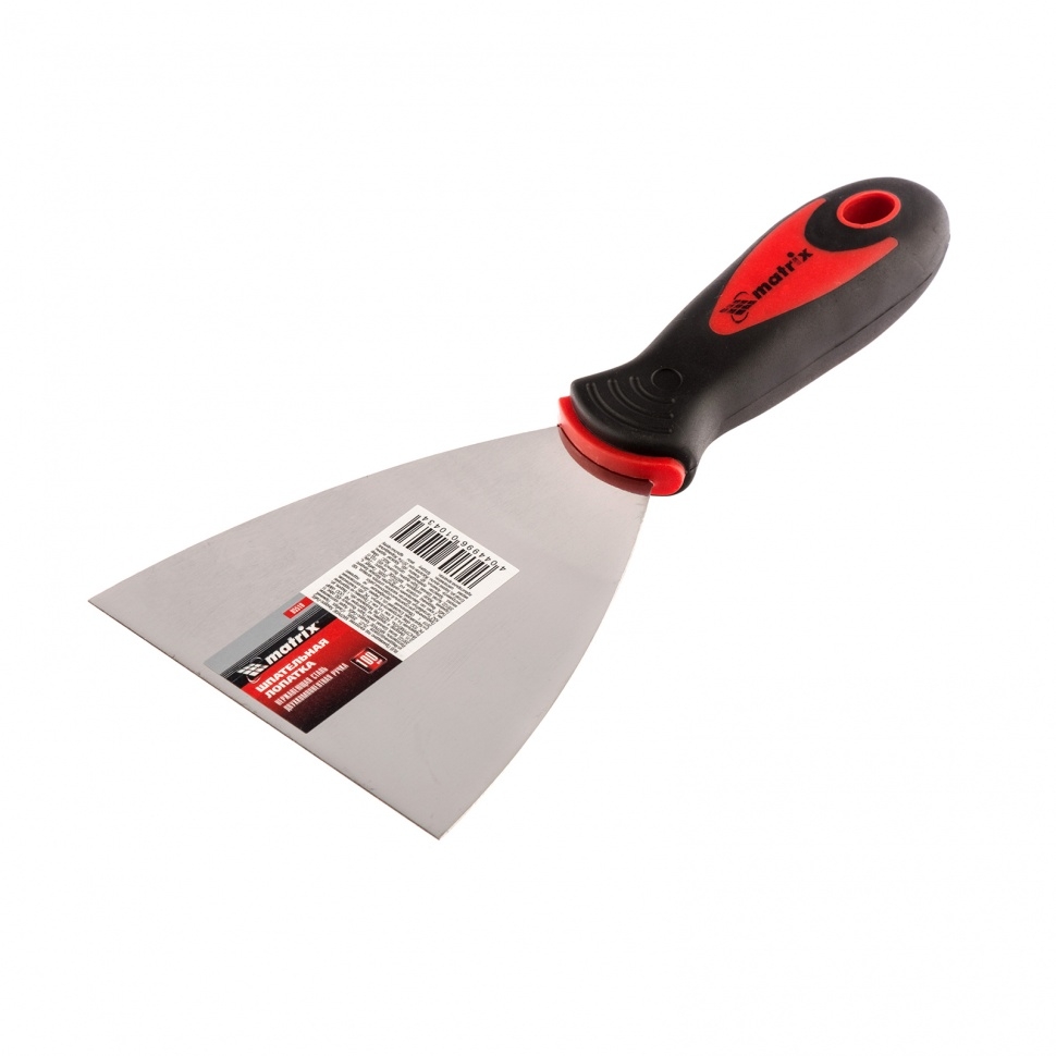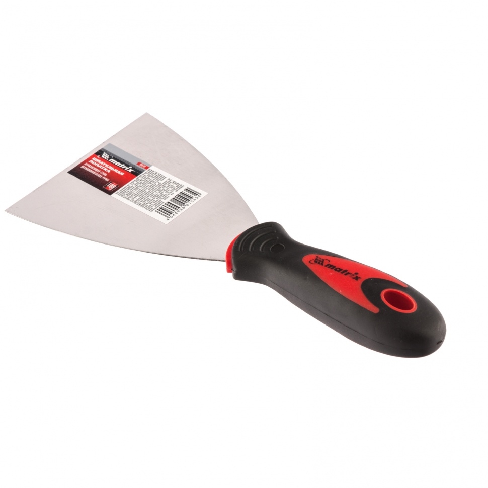 Шпательная лопатка из нержавеющей стали Matrix 85510, шириной 100 мм, с 2-компонентной ручкой, предназначена для нанесения и выравнивания строительных смесей, шпаклевания швов, заполнения трещин, удаления старых обоев. За счет компактных размеров инструмент подходит для корректировки мелких трещин и неровностей.