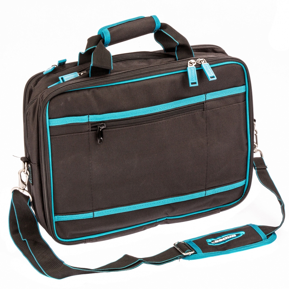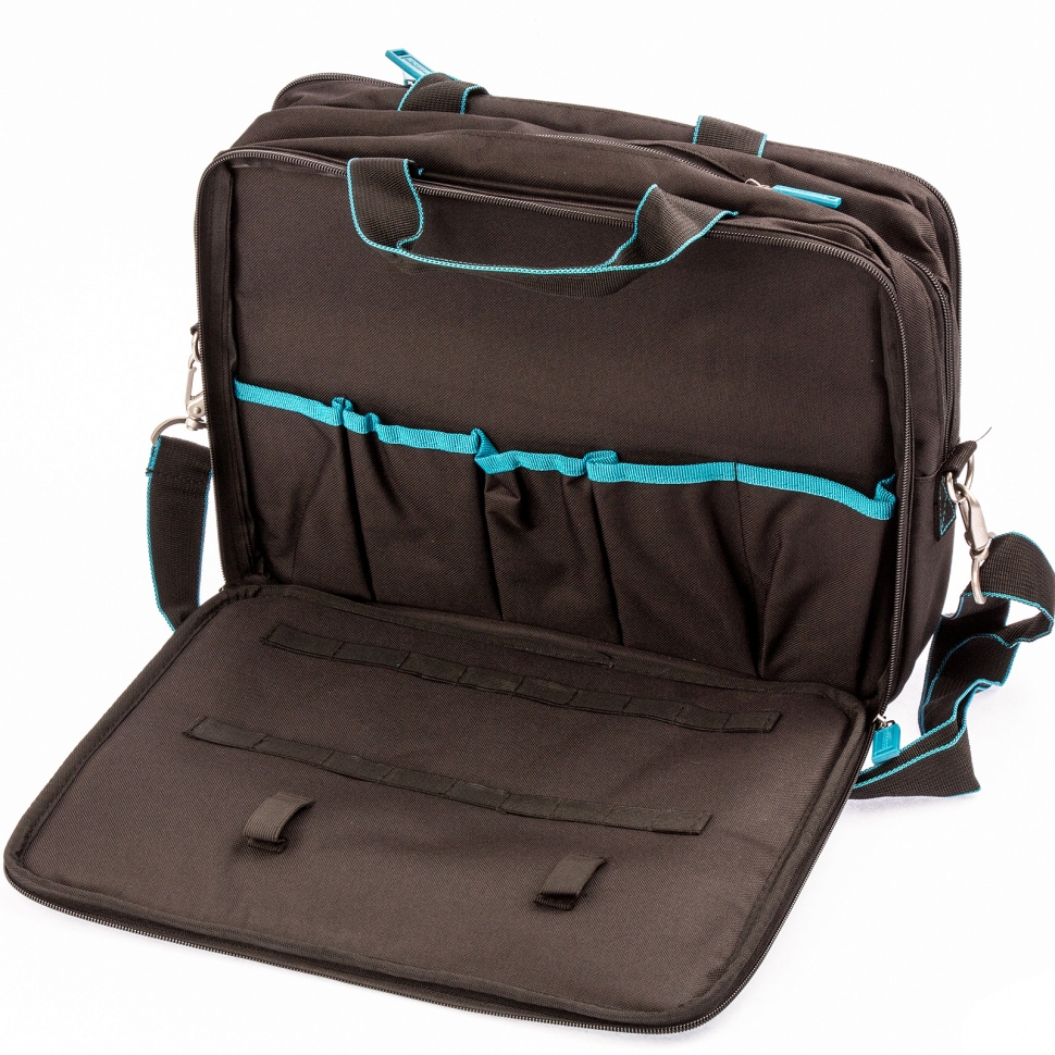 Сумка для инструмента предназначена для переноса и хранения ручного инструмента, документов формата А4, а также ноутбука с диагональю экрана до 15.Множество удобных карманов и прижимных резинок позволяют быстро устанавливать и фиксировать инструменты в сумке.Сумка оснащена удобными рукоятками для переноски, а также наплечным ремнем.Длина сумки 410 мм.