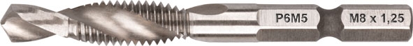 Сверло-Метчик комбинированное метрическое. Для сверления отверстий и нарезания резьбы в легированных и нелигированных сталях, цветных металлах и чугуне. Шлифованный профиль, правостороннее, метрическая резьба. Шестигранный U-образный хвостик. Материал: быстрорежущая (HSS) сталь P6M5. Упаковка : блистер.
