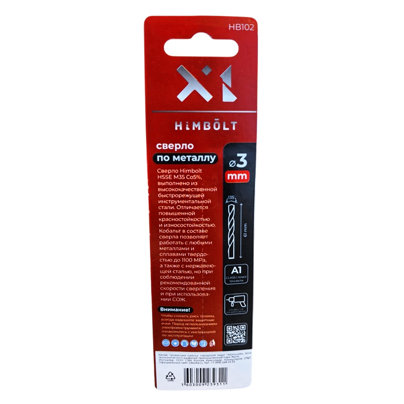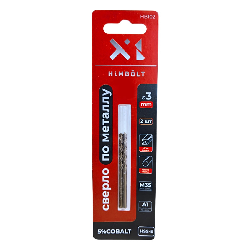 Сверло по металлу с кобальтом 5% P6M5K5 3,0 мм HIMBOLT 2 шт.блистер выполнено из высококачественной быстрорежущей инструментальной стали. Отличается повышенной красностойкостью и износостокойстью. Кобальт в составе сверла позволяет работать с любыми металлами и сплавами твердостью до 1100 МРА, а также с нержавеющей сталью, но при соблюдении рекомендованной скорости сверления и при использовании СОЖ.