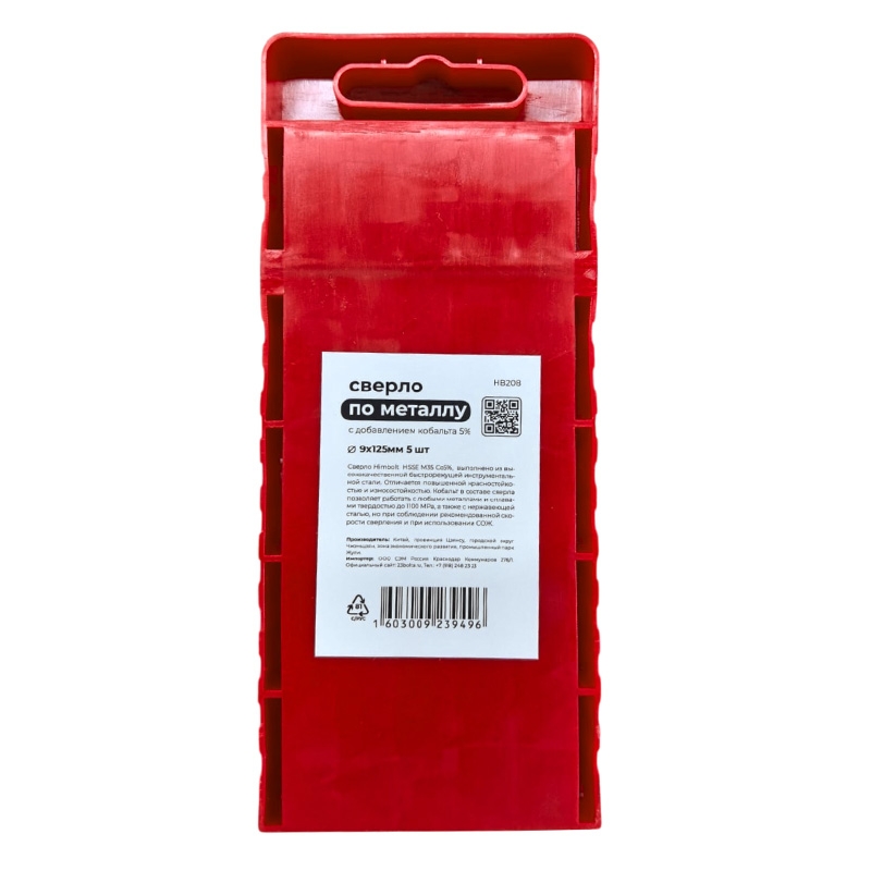 Сверло по металлу с кобальтом 5% P6M5K5 9,0 мм HIMBOLT 5 шт.пласт.бокс выполнено из высококачественной быстрорежущей инструментальной стали. Отличается повышенной красностойкостью и износостокойстью. Кобальт в составе сверла позволяет работать с любыми металлами и сплавами твердостью до 1100 МРА, а также с нержавеющей сталью, но при соблюдении рекомендованной скорости сверления и при использовании СОЖ.