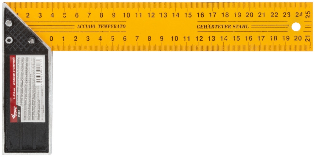 Угольник столярный желтый 250 мм. Шкала двусторонняя. Материал: линейка из инструментальной стали, основание из алюминиевого сплава.