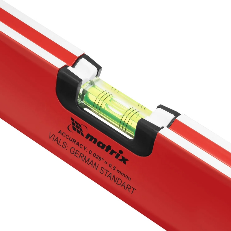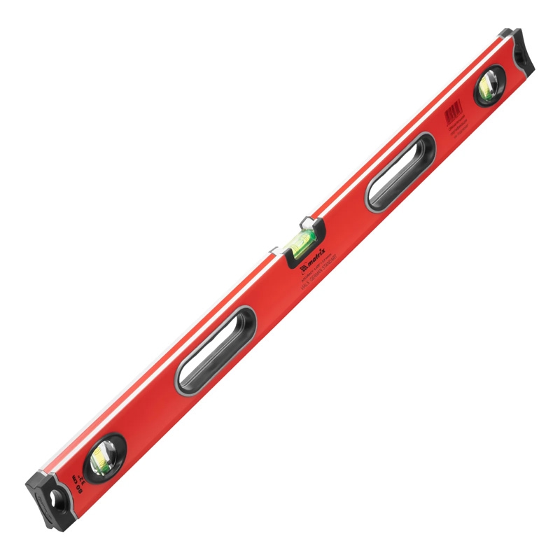 Уровень алюминиевый с ударопрочными заглушками 3 глазка 2-хкомп.рук. 800 мм Matrix — практичный инструмент для контроля геометрии поверхностей. Его длина составляет 800 мм, что делает его удобным как для масштабных строительных работ, так и для мелких бытовых задач.