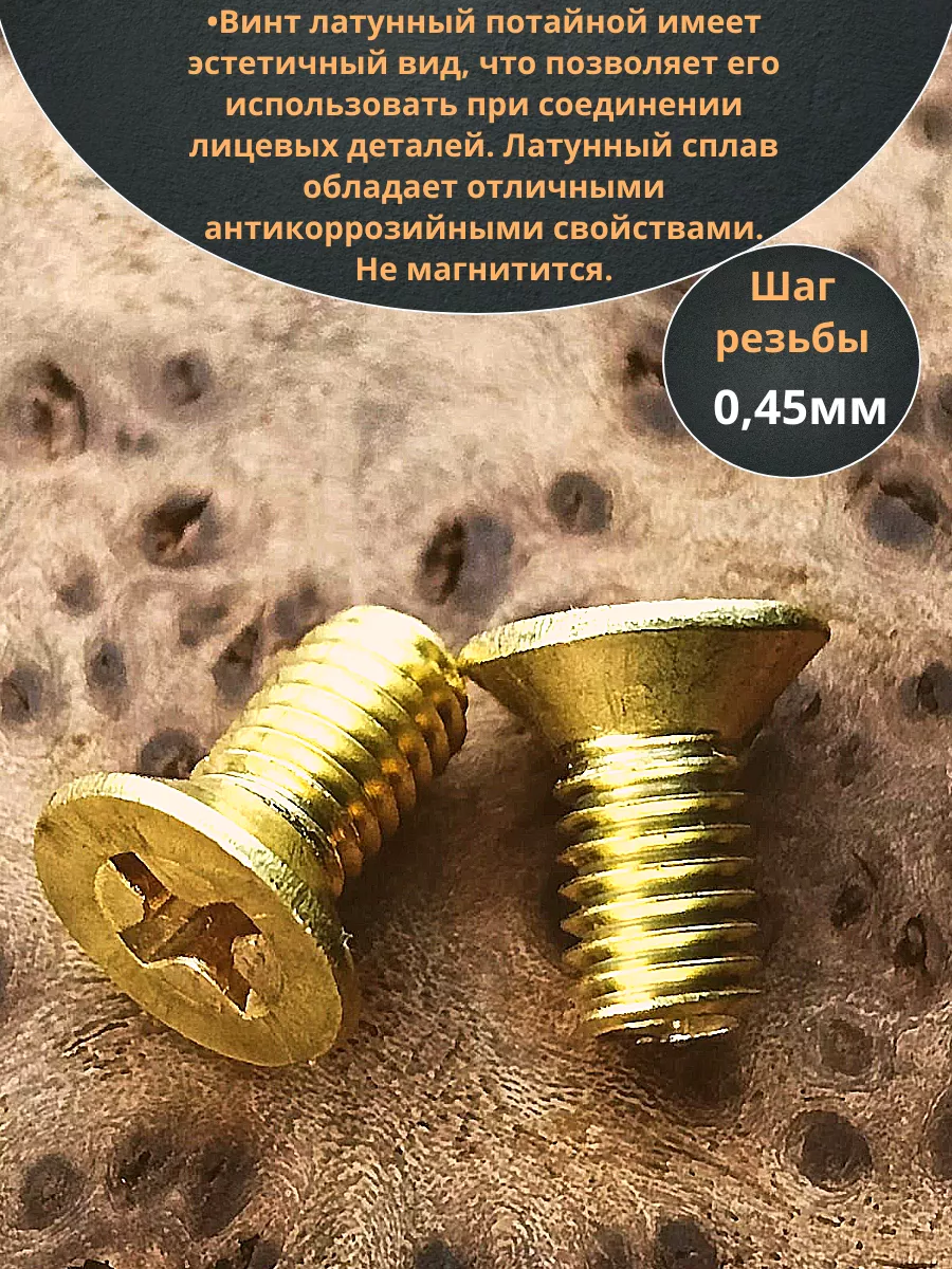 Винт с потайной головкой и крестообразным шлицем, латунный DIN 965 (ISO 7046) - крепежное изделие из высококачественного сплава с оптимальным сочетанием пластичности и прочности. Он имеет полную стандартную метрическую резьбу от М1,6 до М10, его длина (измеряется с головкой) находится в пределах 3-40 мм. Применяется для создания разъемного резьбового соединения деталей и элементов конструкций из латуни, меди, латунированной стали, пластиков, древесины. Винт потай крест из латуни обладает повышенной стойкостью к коррозии и влиянию сильноагрессивных сред. Нагрузка на разрыв составляет 300-440 Н/мм², что сопоставимо с аналогичными стальными метизами нормальной прочности. Стабильность свойств гарантирована даже при критически низких температурах. Магнитная пассивность и электрическая проводимость латуни обуславливают его применение при сборке электроники, электротехники и приборов. Винт латунный потайной крестовый подлежит установке в резьбовое отверстие базового элемента.