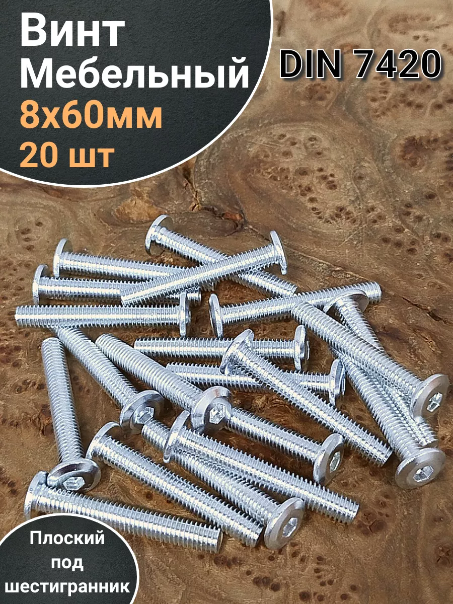 Винт мебельный 8х60 плоский под шестигранник DIN7420,20 шт