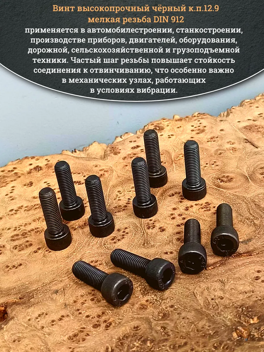 Винт имеет высокую цилиндрическую головку, предназначен для установки его с углублением в отверстие. Закручивается винт при помощи ключа-шестигранника. Высокопрочный винт DIN 912 обеспечивает надежное скрепление узлов и деталей в монтажных и других видах работ. Он имеет головку цилиндрической формы с углублением под соответствующий шестигранный ключ.