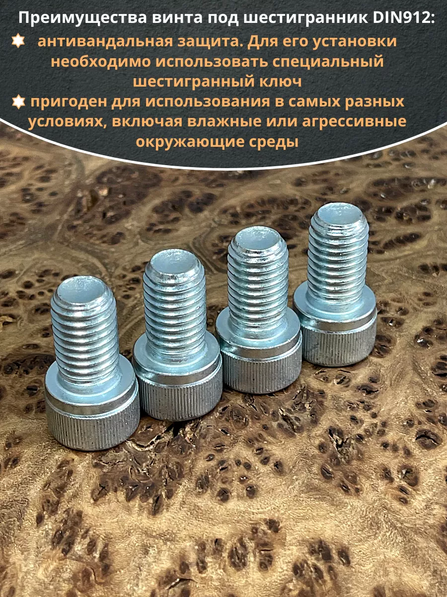 Винт (болт) с внутренним шестигранником (оцинкованный) DIN 912 – высокопрочный метрический крепеж из стали класса прочности 12.9 с цинковым покрытием, без которого не обходятся такие отрасли промышленности как машиностроение, приборостроение, производство станков, промышленного оборудования, дорожной и строительной техники. Механические свойства винта под шестигранник гарантируют надежность узла крепления при повышенных нагрузках и вибрации, возможность приложения высокого момента затяжки при помощи имбусового ключа и возможность многократной сборки/разборки без риска быстрого износа шлица. Гальваническая оцинковка болтов с внутренним шестигранником защищает их от коррозии в нормальных и слабоагрессивных условиях внешней среды. Высокопрочные винты с цилиндрической головкой под ключ-шестигранник выпускаются в классе высокой точности – А, с полем допуска резьбы 6g и в широком диапазоне диаметров и длин. Изделия имеют стержень с полной или неполной резьбой.