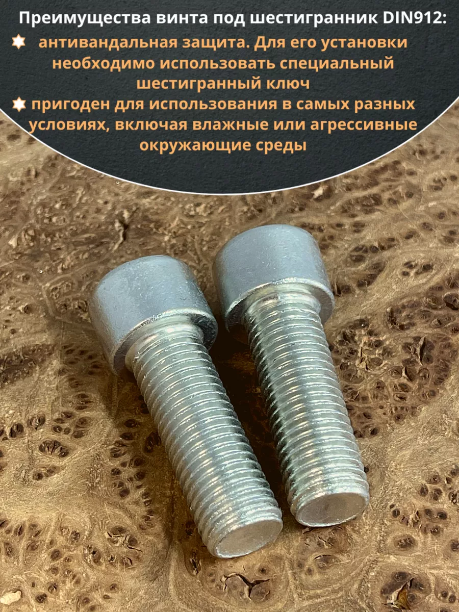 Винт DIN 912 представляет собой металлический стержень с метрической резьбой и головкой цилиндрической формы. Изготовляется из разных материалов, в зависимости от области его применения: сталь 8.8,10.9 или 12,9, сталь с оцинкованным покрытием, нержавеющая сталь А2- А5, латунь, пластик. Прочность на разрыв стали подобного класса достаточно высока, поэтому DIN 912 применяют в конструкциях, которые подвержены серьезным нагрузкам. Применяется винт DIN 912 для специфических нужд (соединения различных элементов металлоконструкций совместно с гайками, шайбами соответствующих размеров) в приборостроении, машиностроении, строительных и иных производственно-промышленных отраслях.