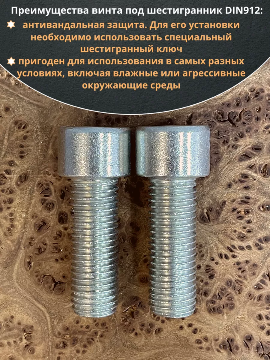 Метрический крепеж повышенного класса прочности 8.8 для высоких нагрузок. Используется при сборке машин, механизмов, оборудования, мебели, строительных конструкций и различных видов транспорта. Цилиндрическая головка без накатки с внутренним шестигранником. Установочный инструмент: ключ-шестигранник (Inbus) – один из лучших типов привода для тугой затяжки. Может использоваться без гайки в резьбовых отверстиях или совместно с гайкой и шайбой. Часто применяется в местах, где недостаточно пространства для затягивания болтов с шестигранной головкой.