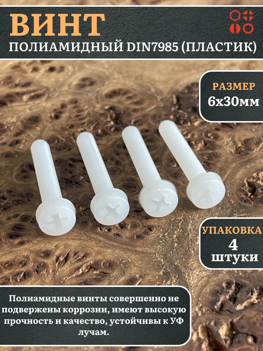 Винт полиамидный 6х30 мм DIN7985 (пластик), 4 шт.