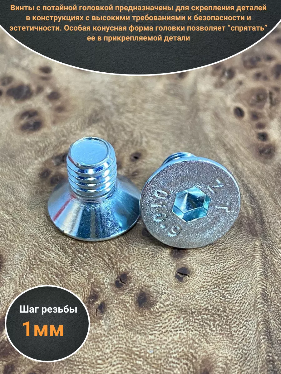 Винты с потайной головкой предназначены для скрепления деталей в конструкциях с высокими требованиями к безопасности и эстетичности. Особая конусная форма головки позволяет “спрятать” ее в прикрепляемой детали. При этом поверхность головки находится в одной плоскости с поверхностью детали. Крепёж с такими свойствами высоко востребован в машино-, автомобилестроении, при сборке бытовой техники, в приборостроении. Конструкция винта DIN 7991 включает стержень с метрической резьбой, потайную головку и шестигранное углубление под ключ для передачи крепежному изделию крутящего момента. Шестигранный внутренний диаметр углубления дает возможность подавать гораздо большее усилие при установке в контакте с ключом или битой. Винты DIN 7991 могут изготавливаться из углеродистых и легированных сталей