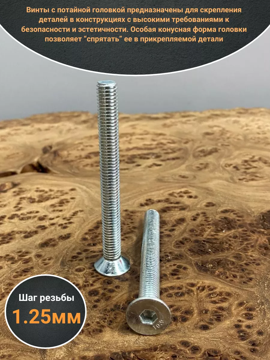 Винты с потайной головкой предназначены для скрепления деталей в конструкциях с высокими требованиями к безопасности и эстетичности. Особая конусная форма головки позволяет “спрятать” ее в прикрепляемой детали. При этом поверхность головки находится в одной плоскости с поверхностью детали. Крепёж с такими свойствами высоко востребован в машино-, автомобилестроении, при сборке бытовой техники, в приборостроении. Конструкция винта DIN 7991 включает стержень с метрической резьбой, потайную головку и шестигранное углубление под ключ для передачи крепежному изделию крутящего момента. Шестигранный внутренний диаметр углубления дает возможность подавать гораздо большее усилие при установке в контакте с ключом или битой. Винты DIN 7991 могут изготавливаться из углеродистых и легированных сталей