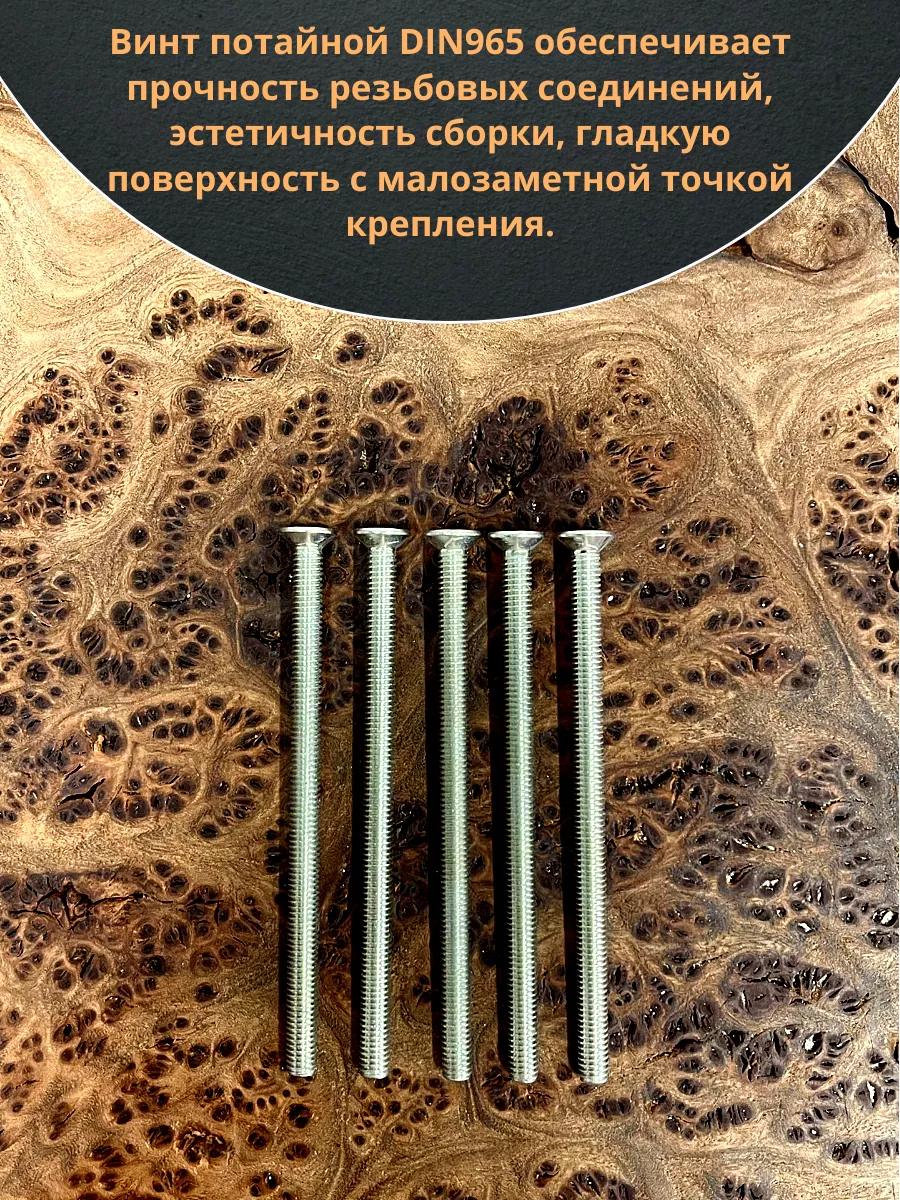 Винт с потайной головкой состоит из головки и стержня с полной резьбой, нарезанной по всей длине шпильки, не имеющего заострения на конце, предназначен для соединения деталей. Монтаж может быть сквозным или глухим. Головка утапливается в материал или конструкцию, не оставаясь на поверхности. Винты DIN 965 используются в строительстве, машиностроении, промышленных и производственных отраслях совместно с шайбами, гайками соответствующих размеров.