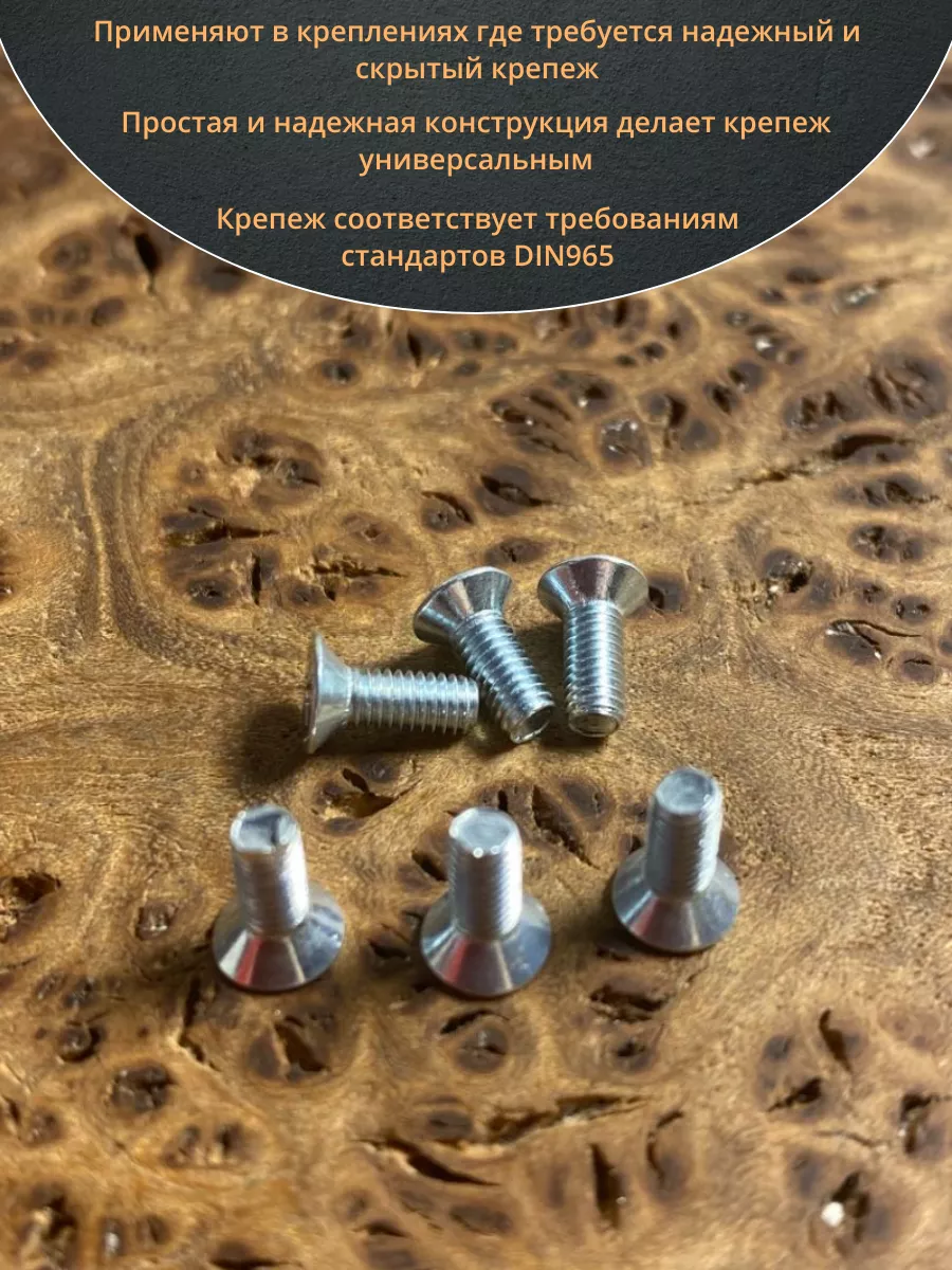 Винт с потайной головкой состоит из головки и стержня с полной резьбой, нарезанной по всей длине шпильки, не имеющего заострения на конце, предназначен для соединения деталей. Монтаж может быть сквозным или глухим. Головка утапливается в материал или конструкцию, не оставаясь на поверхности. Винты DIN 965 используются в строительстве, машиностроении, промышленных и производственных отраслях совместно с шайбами, гайками соответствующих размеров.