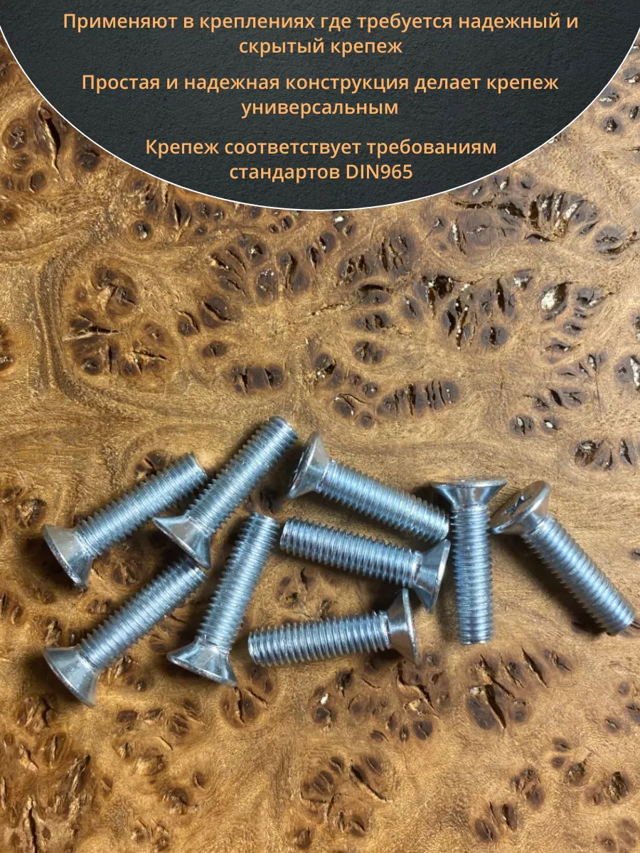 Винт с потайной головкой состоит из головки и стержня с полной резьбой, нарезанной по всей длине шпильки, не имеющего заострения на конце, предназначен для соединения деталей. Монтаж может быть сквозным или глухим. Головка утапливается в материал или конструкцию, не оставаясь на поверхности. Винты DIN 965 используются в строительстве, машиностроении, промышленных и производственных отраслях совместно с шайбами, гайками соответствующих размеров.