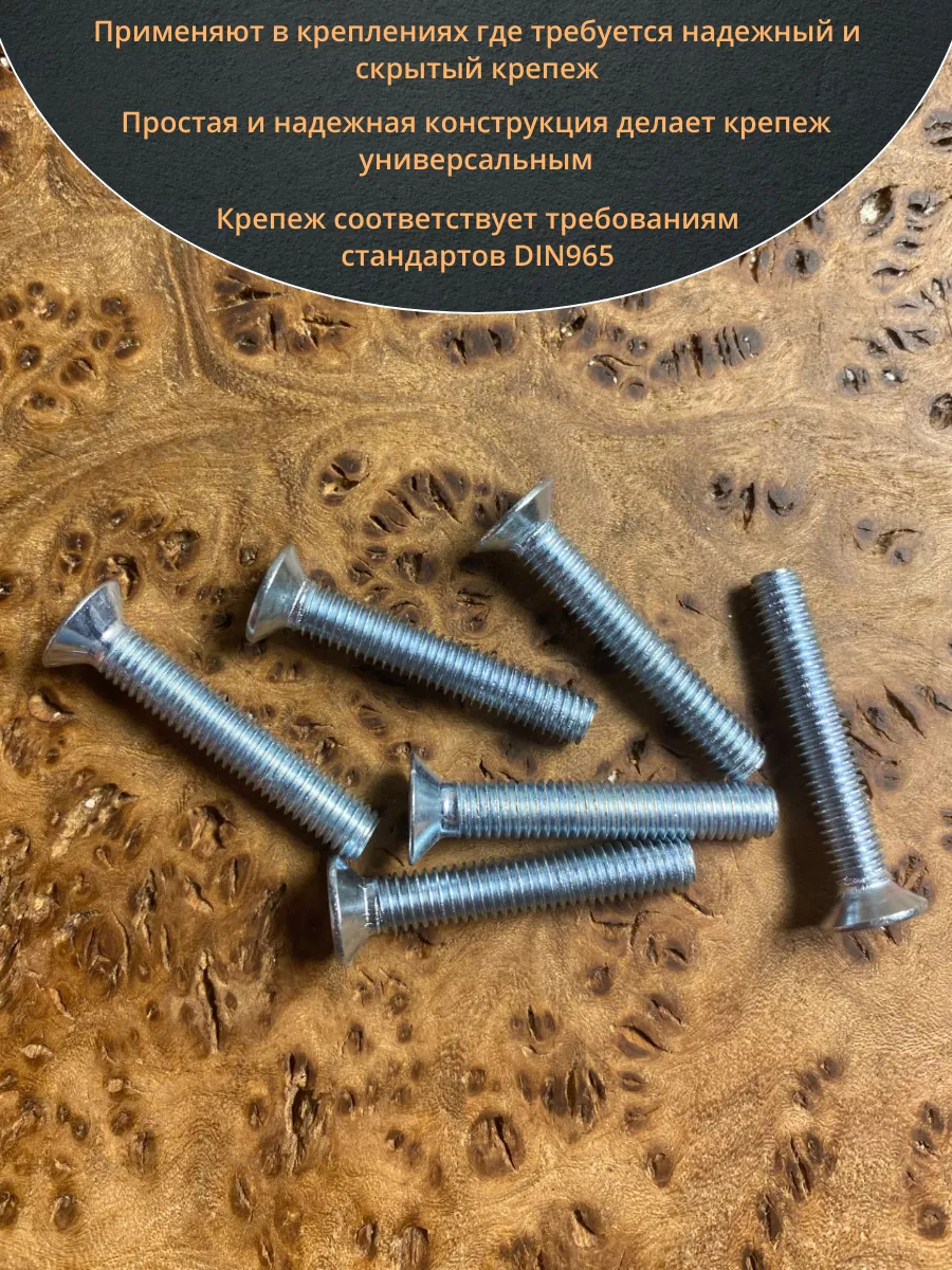Винт с потайной головкой состоит из головки и стержня с полной резьбой, нарезанной по всей длине шпильки, не имеющего заострения на конце, предназначен для соединения деталей. Монтаж может быть сквозным или глухим. Головка утапливается в материал или конструкцию, не оставаясь на поверхности. Винты DIN 965 используются в строительстве, машиностроении, промышленных и производственных отраслях совместно с шайбами, гайками соответствующих размеров.
