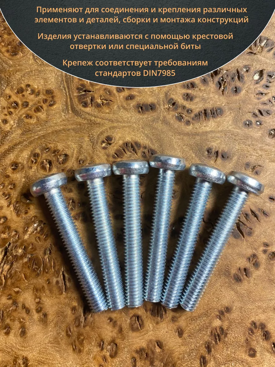 Винт DIN 7985 представляет собой крепежный элемент с полукруглой головкой и шлицем: Philips, Pozi или Torx., подходящим под отвертки и биты. Предназначены для соединения металлических и неметаллических материалов. Винт DIN 7985 используется в производственных, промышленных и строительных областях совместно с шайбами, гайками, втулками и прочими отверстиями с соответствующим размером резьбы, при различных соединениях и креплениях элементов. Производятся из углеродистой стали, нержавеющей стали А2 и А4, латуни, алюминия. Винты, произведенные из углеродистой стали, как правило оцинкованы.