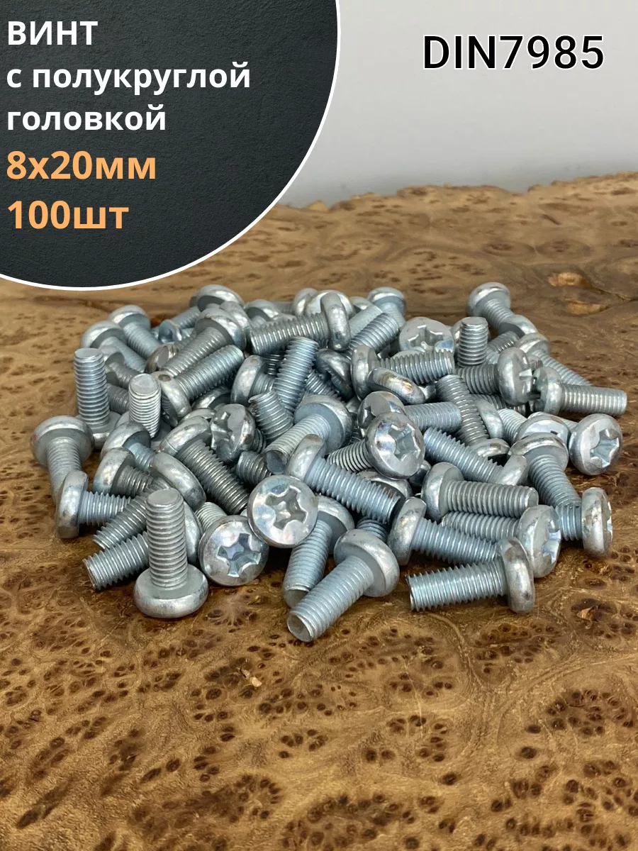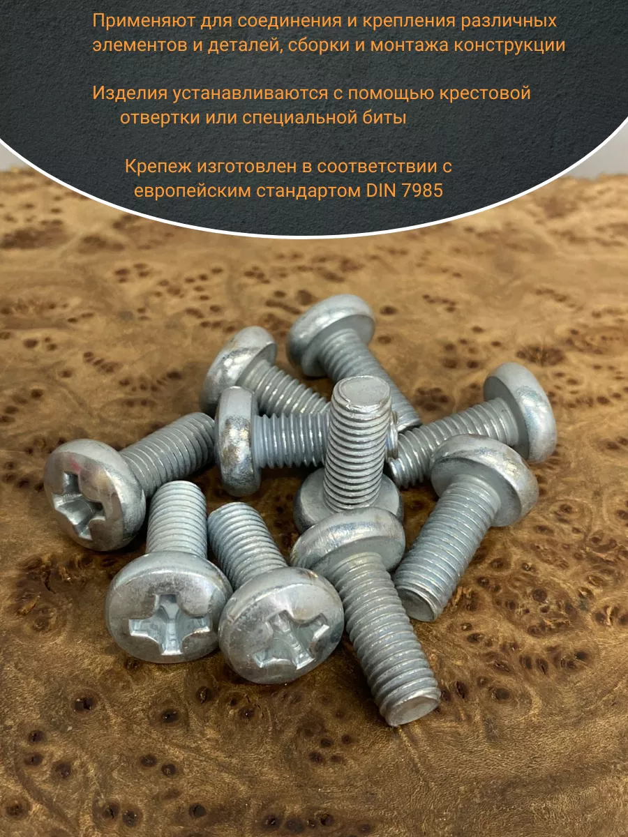 Винт DIN 7985 представляет собой крепежный элемент с полукруглой головкой и шлицем: Philips, Pozi или Torx., подходящим под отвертки и биты. Предназначены для соединения металлических и неметаллических материалов. Винт DIN 7985 используется в производственных, промышленных и строительных областях совместно с шайбами, гайками, втулками и прочими отверстиями с соответствующим размером резьбы, при различных соединениях и креплениях элементов. Производятся из углеродистой стали, нержавеющей стали А2 и А4, латуни, алюминия. Винты, произведенные из углеродистой стали, как правило оцинкованы.
