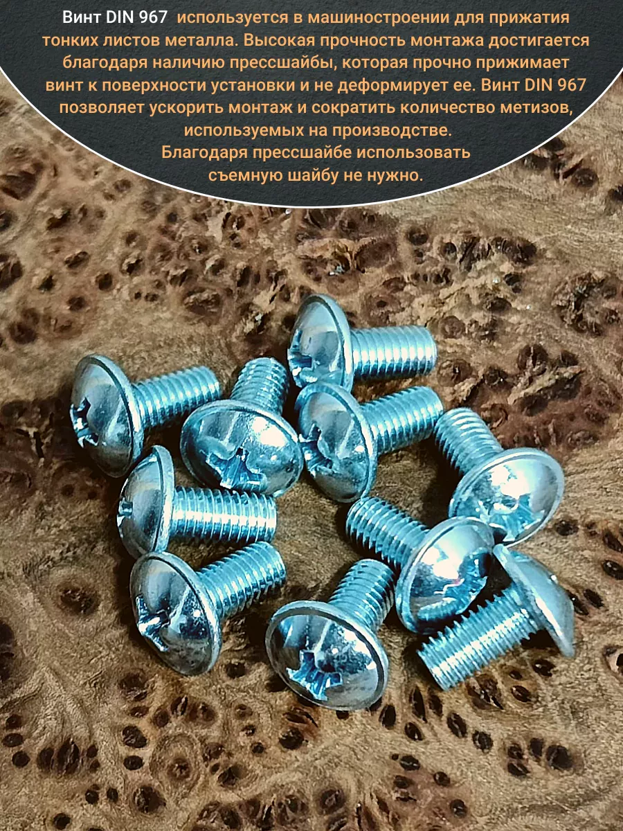 Винт мебельный DIN 967 — это универсальное крепежное изделие в виде стержня с наружной резьбой, выполненной по всей длиннее. Головка крепежа в виде полусферы с широкими полями, на головки имеются пазы под крестовую отвертку. При проведении монтажа можно использовать как PZ, так и SL отвертки или насадки, что делает крепеж универсальным.