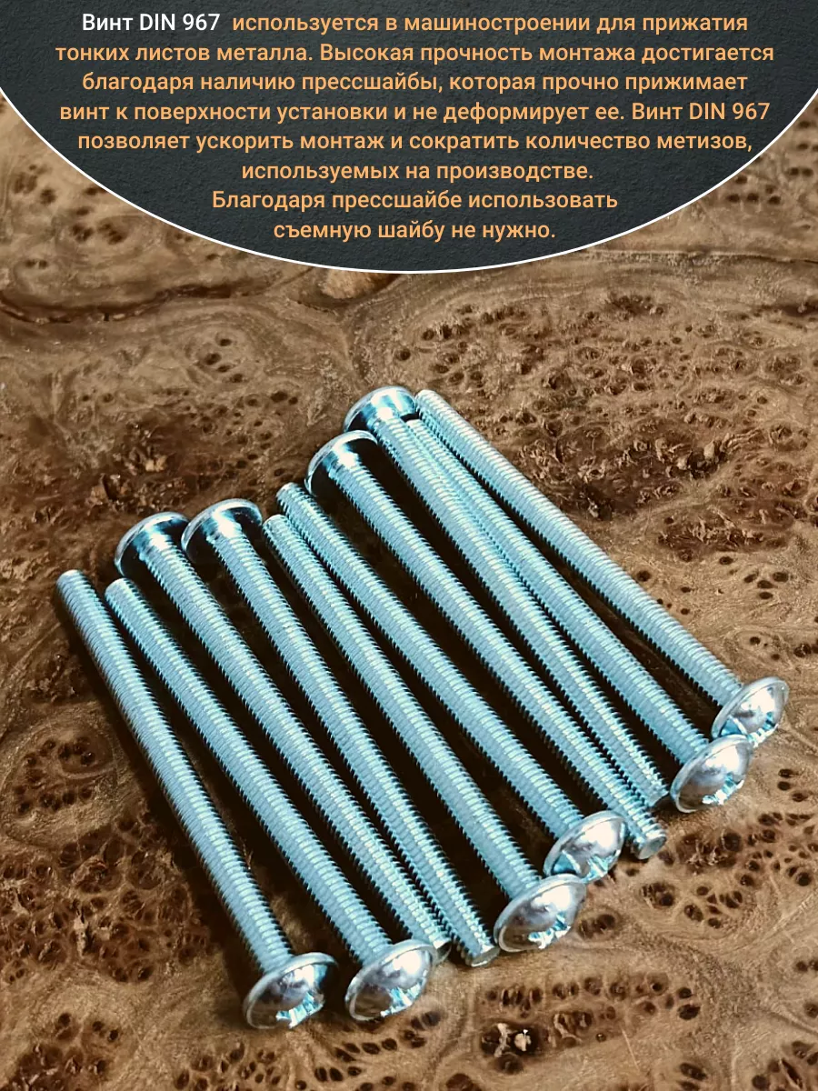 Винт мебельный с полукруглой головкой и прессшайбой, применяется при строительных работах, в машиностроении. Используется для монтажа из металла, пластика и древесины твердых пород. Монтаж производится в заранее подготовленное отверстие с применением гайки соответствующего диаметра, или применятся для вкручивания в различные резьбовые отверстия при монтаже. Винт мебельный DIN 967 — это универсальное крепежное изделие в виде стержня с наружной резьбой, выполненной по всей длинне. Головка крепежа в виде полусферы с широкими полями, на головке имеются пазы под крестовую отвертку. При проведении монтажа можно использовать как PZ, так и SL отвертки или насадки, что делает крепеж универсальным.