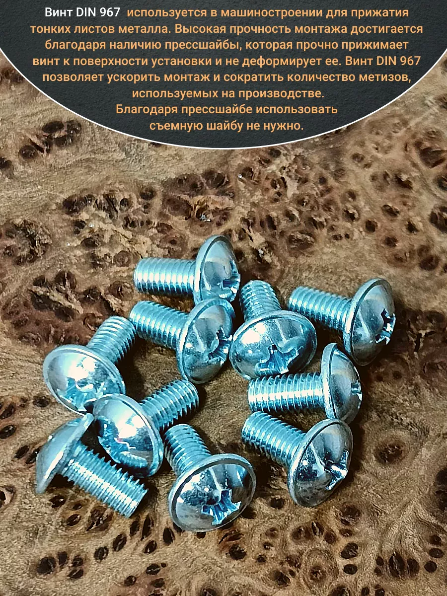 Винт мебельный DIN 967 — это универсальное крепежное изделие в виде стержня с наружной резьбой, выполненной по всей длиннее. Головка крепежа в виде полусферы с широкими полями, на головки имеются пазы под крестовую отвертку. При проведении монтажа можно использовать как PZ, так и SL отвертки или насадки, что делает крепеж универсальным.