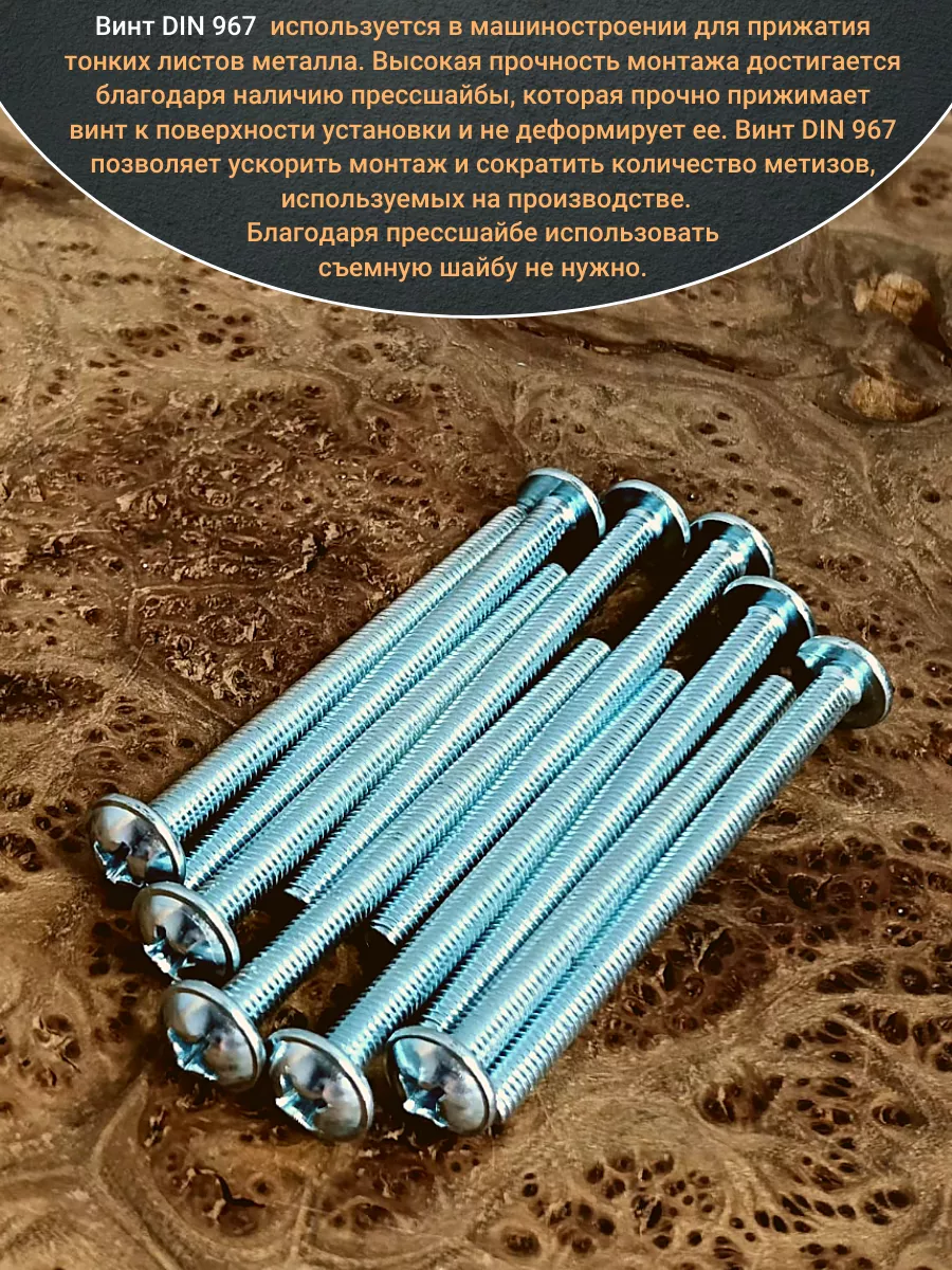 Винт мебельный с полукруглой головкой и прессшайбой, применяется при строительных работах, в машиностроении. Используется для монтажа из металла, пластика и древесины твердых пород. Монтаж производится в заранее подготовленное отверстие с применением гайки соответствующего диаметра, или применятся для вкручивания в различные резьбовые отверстия при монтаже. Винт мебельный DIN 967 — это универсальное крепежное изделие в виде стержня с наружной резьбой, выполненной по всей длинне. Головка крепежа в виде полусферы с широкими полями, на головке имеются пазы под крестовую отвертку. При проведении монтажа можно использовать как PZ, так и SL отвертки или насадки, что делает крепеж универсальным.