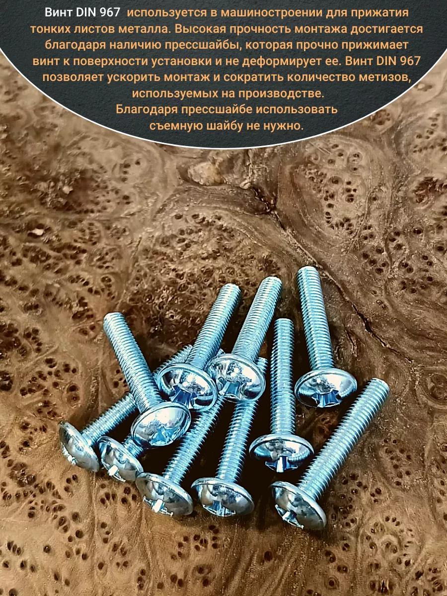 Винт мебельный DIN 967 — это универсальное крепежное изделие в виде стержня с наружной резьбой, выполненной по всей длиннее. Головка крепежа в виде полусферы с широкими полями, на головки имеются пазы под крестовую отвертку. При проведении монтажа можно использовать как PZ, так и SL отвертки или насадки, что делает крепеж универсальным.