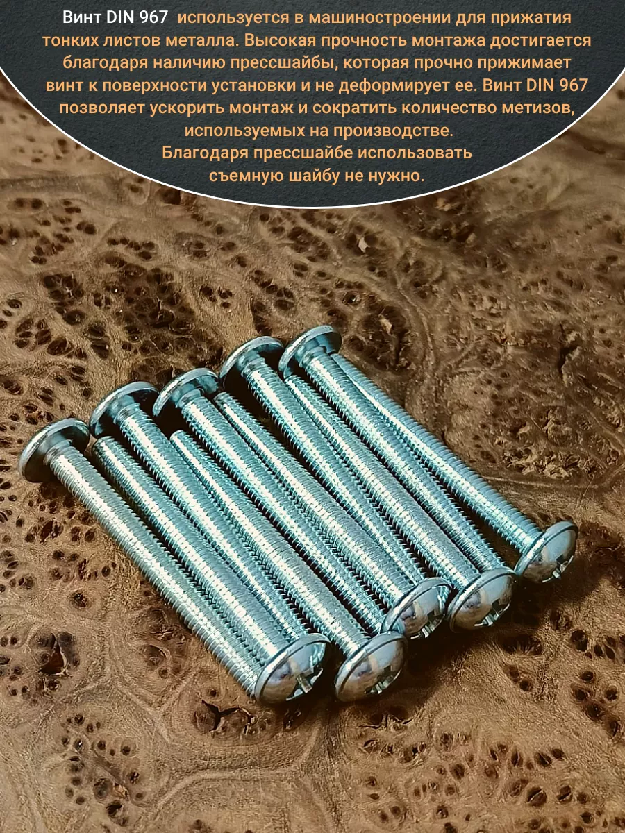 Винт мебельный с полукруглой головкой и прессшайбой, применяется при строительных работах, в машиностроении. Используется для монтажа из металла, пластика и древесины твердых пород. Монтаж производится в заранее подготовленное отверстие с применением гайки соответствующего диаметра, или применятся для вкручивания в различные резьбовые отверстия при монтаже. Винт мебельный DIN 967 — это универсальное крепежное изделие в виде стержня с наружной резьбой, выполненной по всей длинне. Головка крепежа в виде полусферы с широкими полями, на головке имеются пазы под крестовую отвертку. При проведении монтажа можно использовать как PZ, так и SL отвертки или насадки, что делает крепеж универсальным.