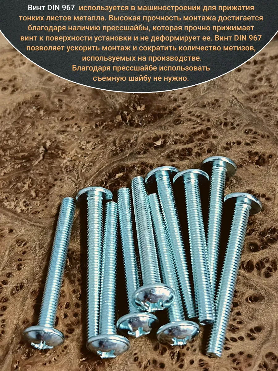 Винт мебельный DIN 967 — это универсальное крепежное изделие в виде стержня с наружной резьбой, выполненной по всей длиннее. Головка крепежа в виде полусферы с широкими полями, на головки имеются пазы под крестовую отвертку. При проведении монтажа можно использовать как PZ, так и SL отвертки или насадки, что делает крепеж универсальным.
