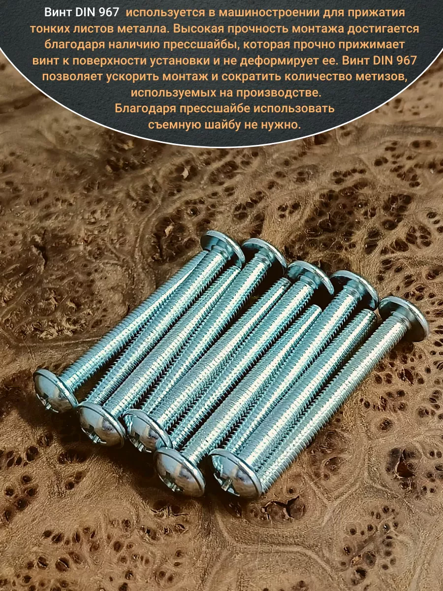 Винт мебельный DIN 967 — это универсальное крепежное изделие в виде стержня с наружной резьбой, выполненной по всей длиннее. Головка крепежа в виде полусферы с широкими полями, на головки имеются пазы под крестовую отвертку. При проведении монтажа можно использовать как PZ, так и SL отвертки или насадки, что делает крепеж универсальным.