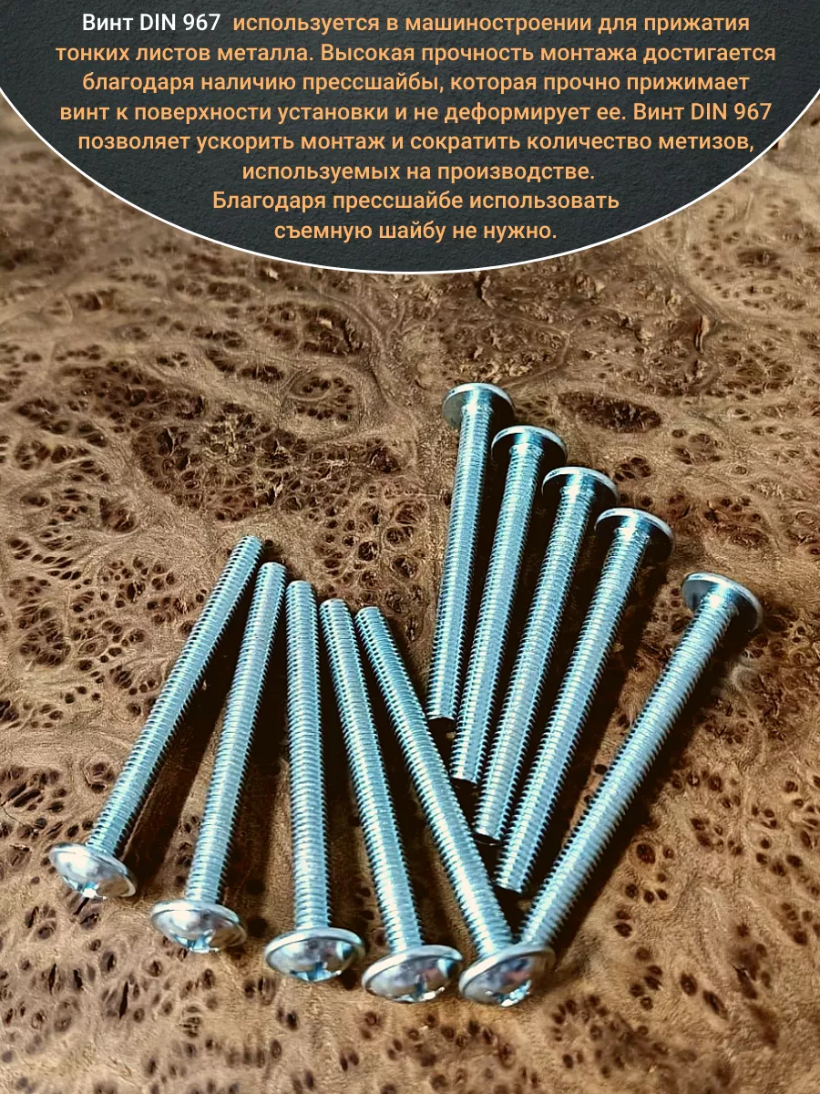 Винт мебельный DIN 967 — это универсальное крепежное изделие в виде стержня с наружной резьбой, выполненной по всей длиннее. Головка крепежа в виде полусферы с широкими полями, на головки имеются пазы под крестовую отвертку. При проведении монтажа можно использовать как PZ, так и SL отвертки или насадки, что делает крепеж универсальным.