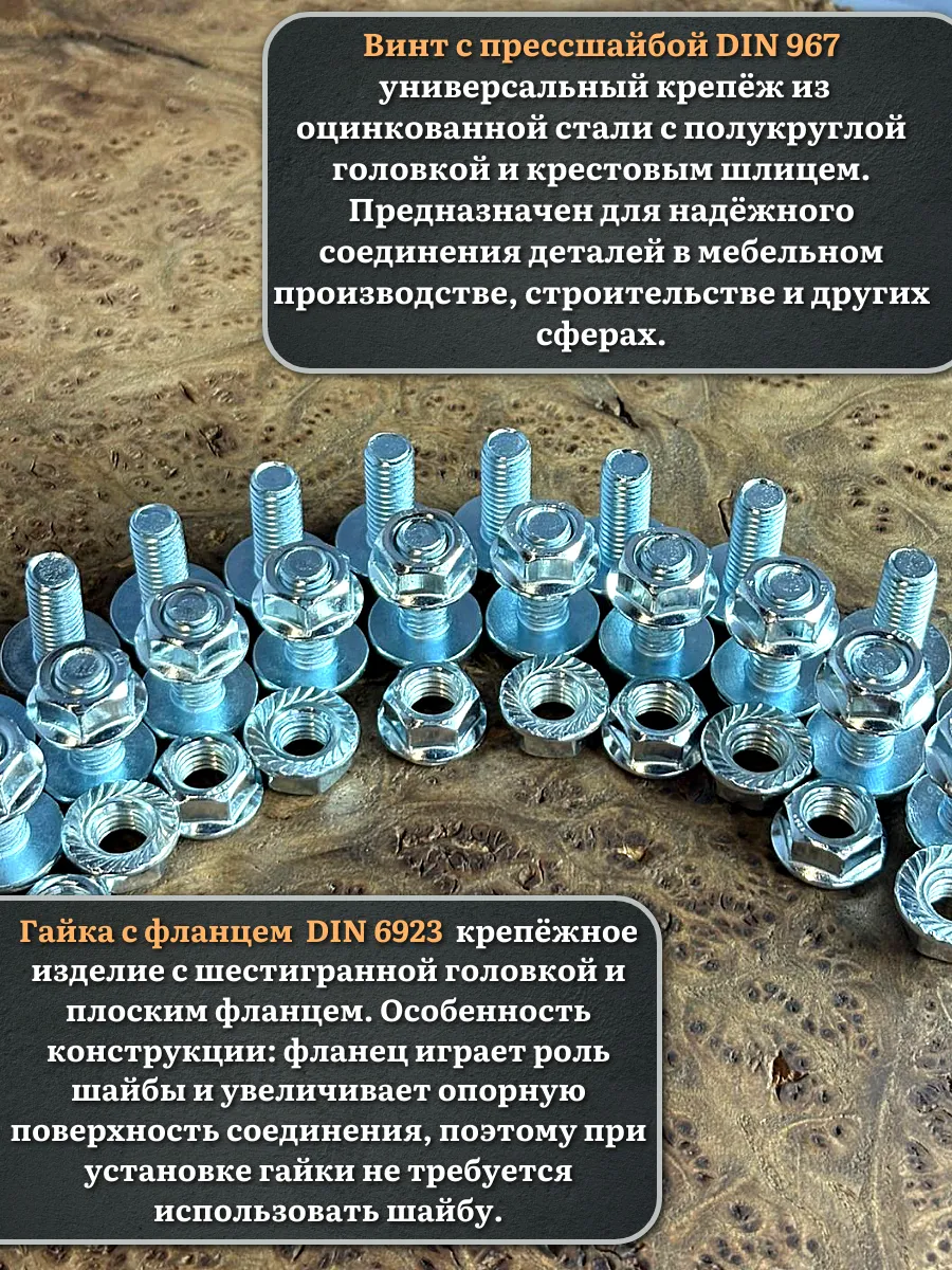 Винт мебельный с полукруглой головкой и прессшайбой, применяется при строительных работах, в машиностроении. Используется для монтажа из металла, пластика и древесины твердых пород. Монтаж производится в заранее подготовленное отверстие с применением гайки соответствующего диаметра, или применятся для вкручивания в различные резьбовые отверстия при монтаже.