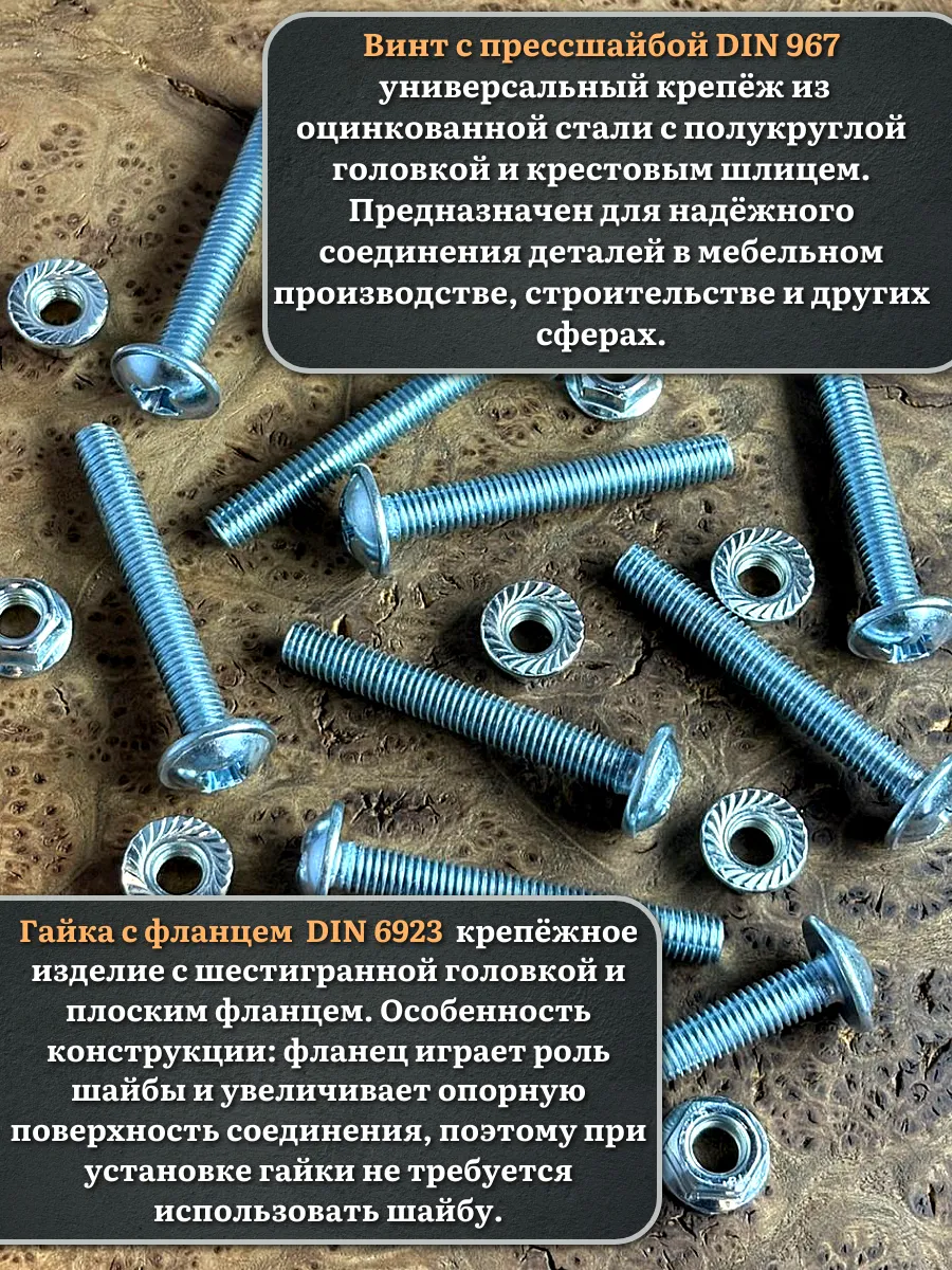 Винт мебельный с полукруглой головкой и прессшайбой, применяется при строительных работах, в машиностроении. Используется для монтажа из металла, пластика и древесины твердых пород. Монтаж производится в заранее подготовленное отверстие с применением гайки соответствующего диаметра, или применятся для вкручивания в различные резьбовые отверстия при монтаже. Винт мебельный DIN 967 — это универсальное крепежное изделие в виде стержня с наружной резьбой, выполненной по всей длинне. Головка крепежа в виде полусферы с широкими полями, на головке имеются пазы под крестовую отвертку. При проведении монтажа можно использовать как PZ, так и SL отвертки или насадки, что делает крепеж универсальным.