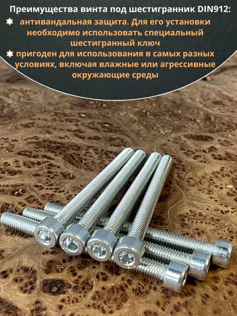 Винт DIN 912 представляет собой металлический стержень с метрической резьбой и головкой цилиндрической формы. Изготовляется из разных материалов, в зависимости от области его применения: сталь 8.8,10.9 или 12,9, сталь с оцинкованным покрытием, нержавеющая сталь А2- А5, латунь, пластик. Прочность на разрыв стали подобного класса достаточно высока, поэтому DIN 912 применяют в конструкциях, которые подвержены серьезным нагрузкам. Применяется винт DIN 912 для специфических нужд (соединения различных элементов металлоконструкций совместно с гайками, шайбами соответствующих размеров) в приборостроении, машиностроении, строительных и иных производственно-промышленных отраслях.