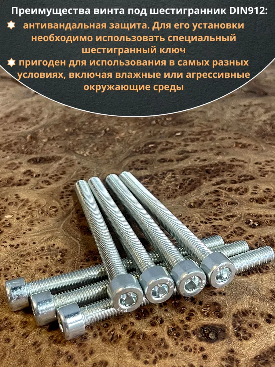 Винт DIN 912 представляет собой металлический стержень с метрической резьбой и головкой цилиндрической формы. Изготовляется из разных материалов, в зависимости от области его применения: сталь 8.8,10.9 или 12,9, сталь с оцинкованным покрытием, нержавеющая сталь А2- А5, латунь, пластик. Прочность на разрыв стали подобного класса достаточно высока, поэтому DIN 912 применяют в конструкциях, которые подвержены серьезным нагрузкам. Применяется винт DIN 912 для специфических нужд (соединения различных элементов металлоконструкций совместно с гайками, шайбами соответствующих размеров) в приборостроении, машиностроении, строительных и иных производственно-промышленных отраслях.